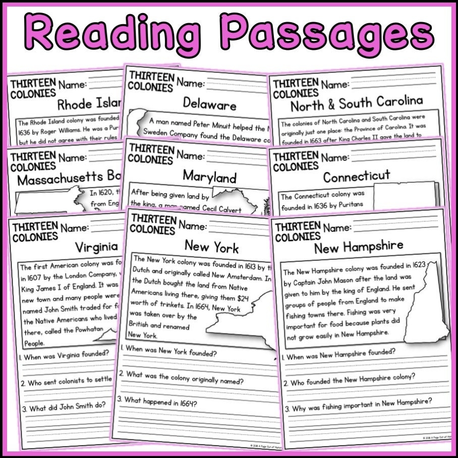 Thirteen Colonies Reading Comprehension Passages K 2 Homeschool Social Studies Printable Worksheets Colonial America Etsy Canada