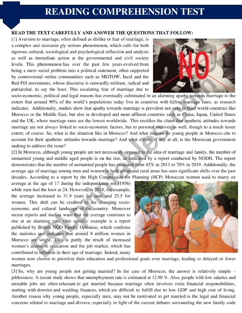Advanced Reading Comprehension Aversion To Marriage ESL Worksheet By OmarBoualloul