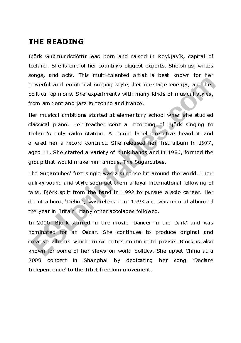 Bjork Advanced Reading And Comprehension Questions ESL Worksheet By Misslinz2315