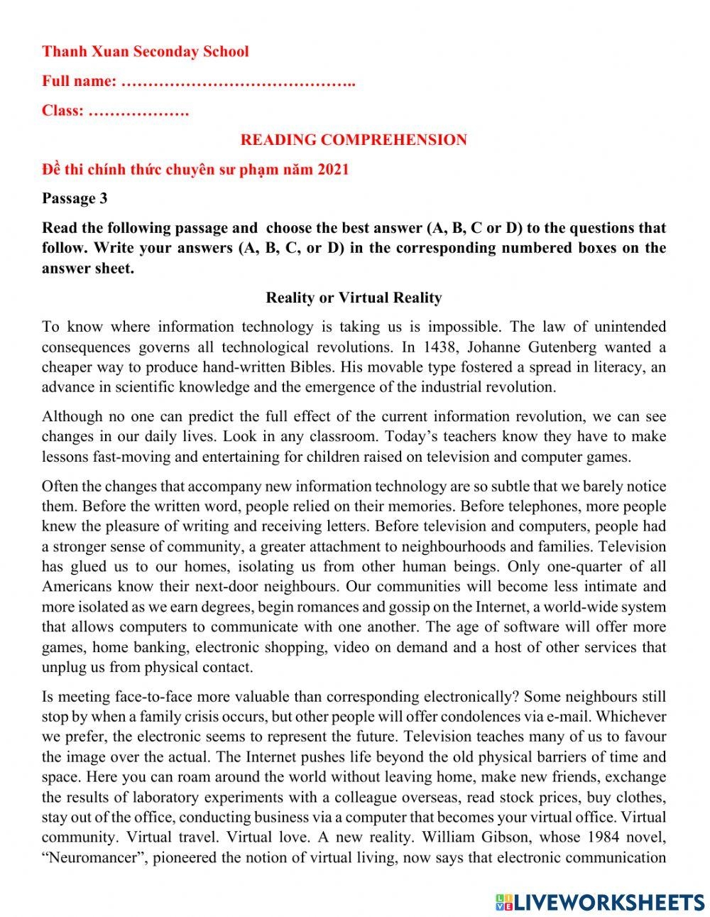 Reading Comprehension Advanced Worksheet Live Worksheets Worksheets Library