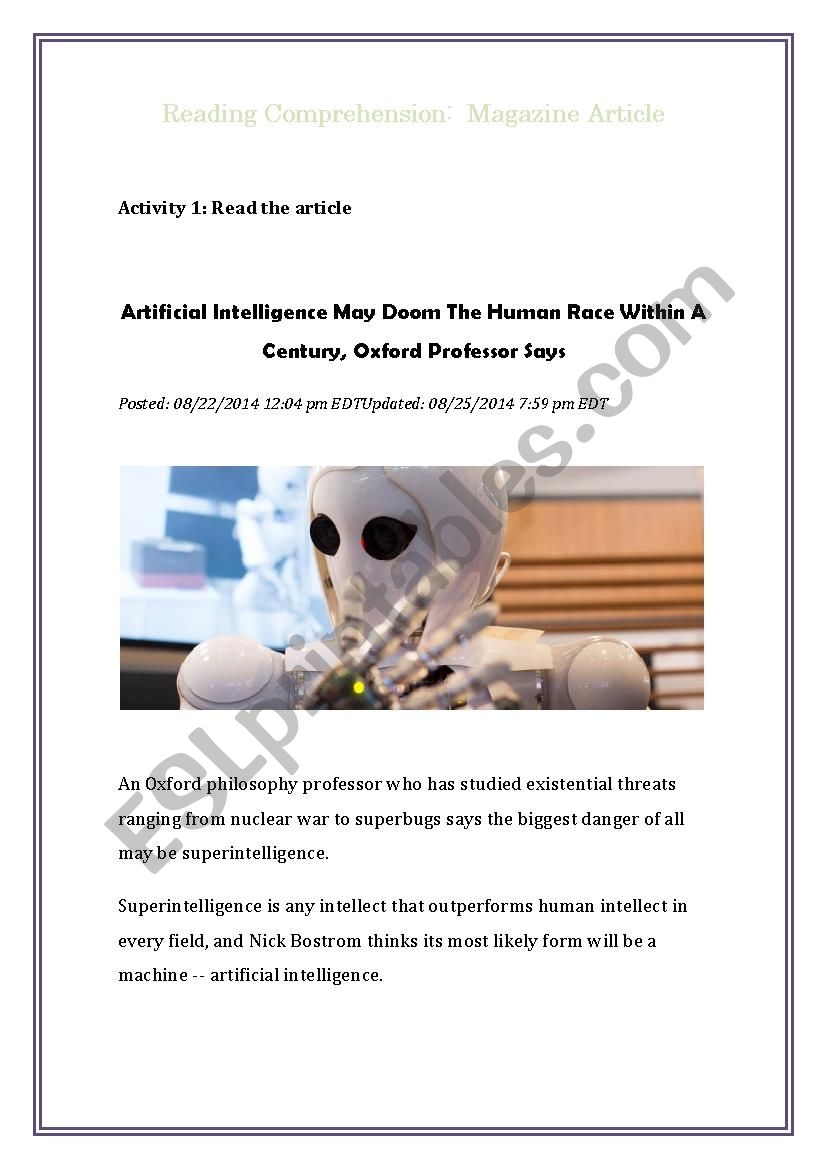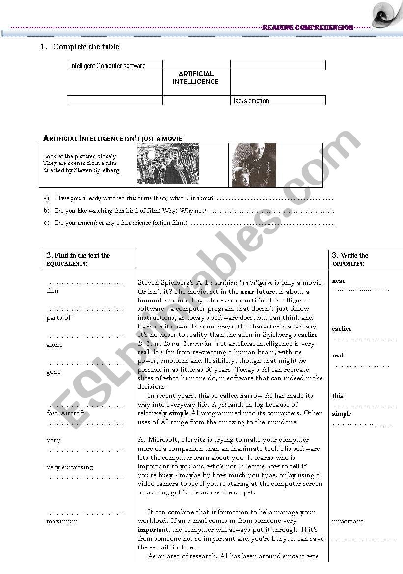 ARTIFICIAL INTELLIGENCE Reading Comprehension ESL Worksheet By Aleia