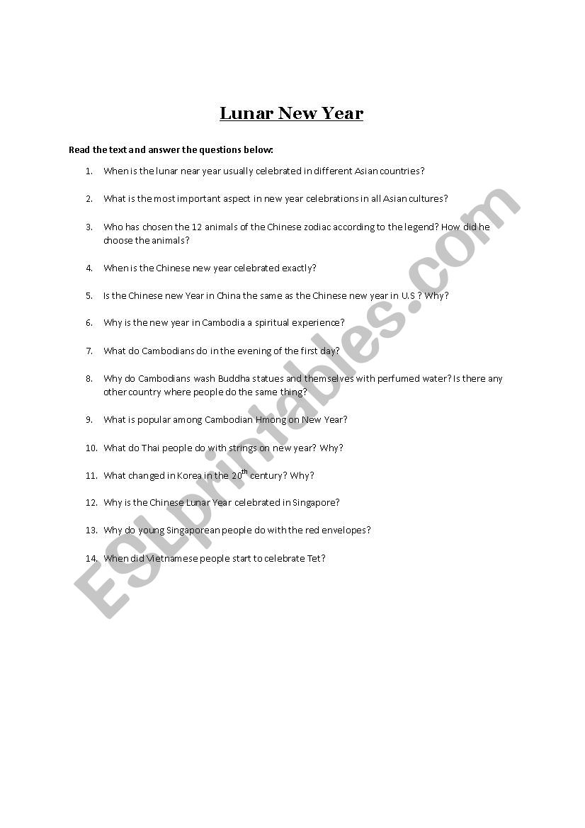 Reading Comprehension Lunar New Year Across Asia ESL Worksheet