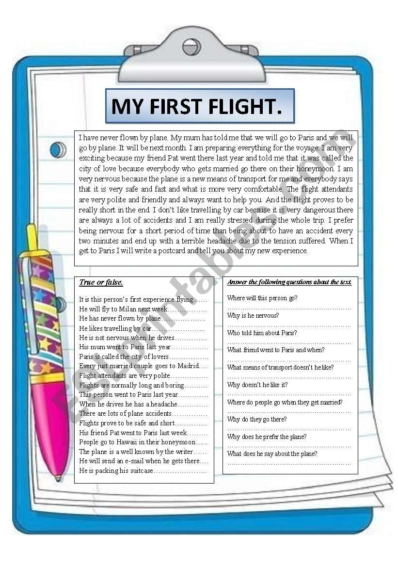 My First Flight Reading Comprehension ESL Worksheet By Montseteacher