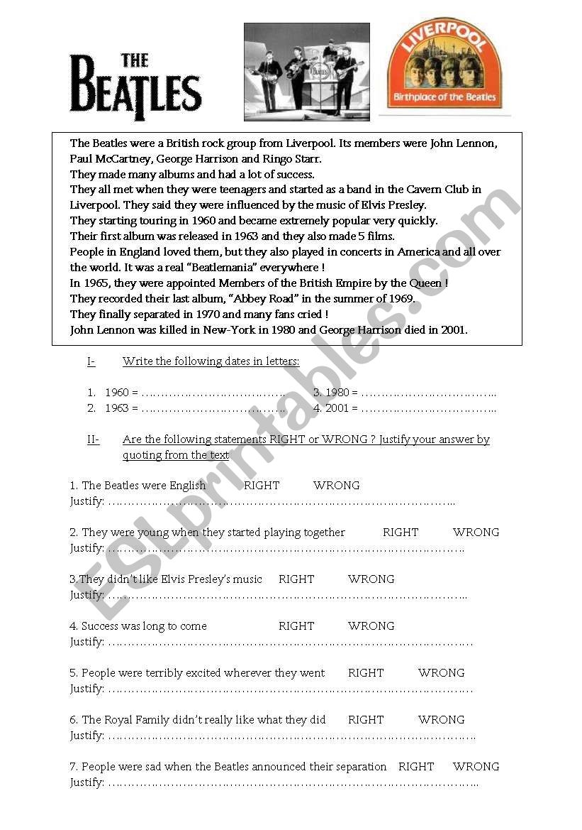 English Worksheets Beatles Reading Comprehension