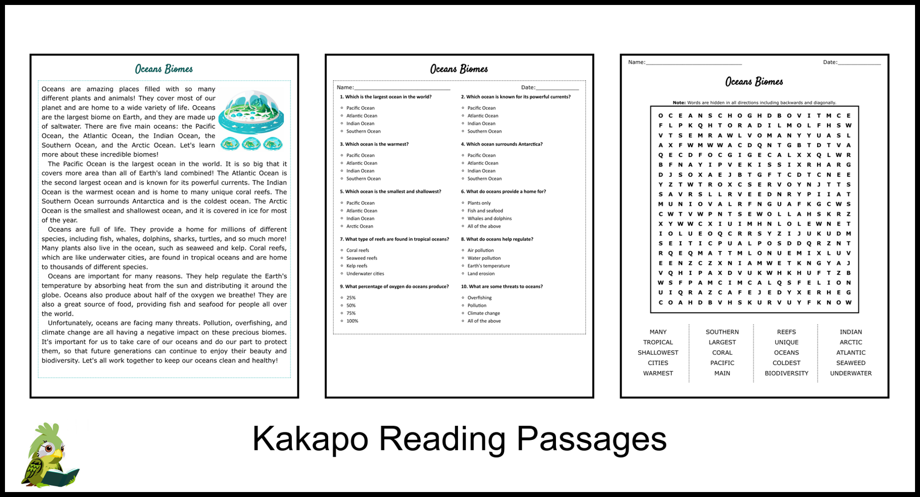 Oceans Biomes Reading Comprehension And Word Search Teaching Resources