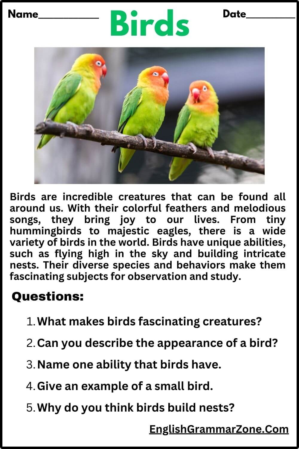 In conclusion, birds reading comprehension worksheets are an excellent way to make learning fun and engaging for students of all ages. By combining informative passages with thought-provoking questions, these worksheets not only enhance reading skills but also foster a love for nature and wildlife. Give them a try and watch your students soar to new heights!
