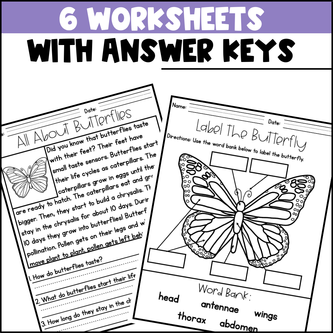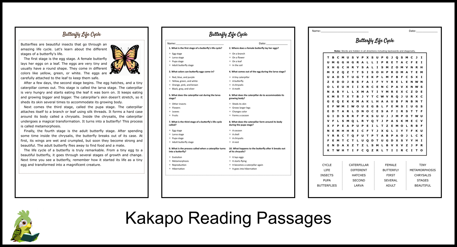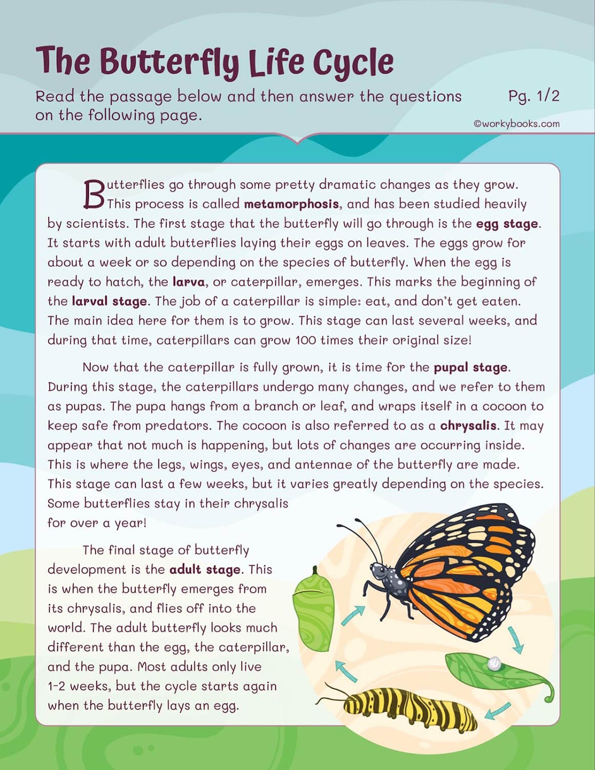 Each worksheet includes passages of text about different stages of the butterfly life cycle, followed by questions that test the child’s understanding of the material. These questions can range from simple multiple-choice questions to more complex open-ended questions that require critical thinking skills.
