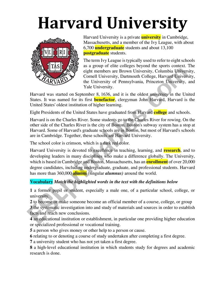 Harvard University reading Comprehension ESL Worksheet By Tlektor