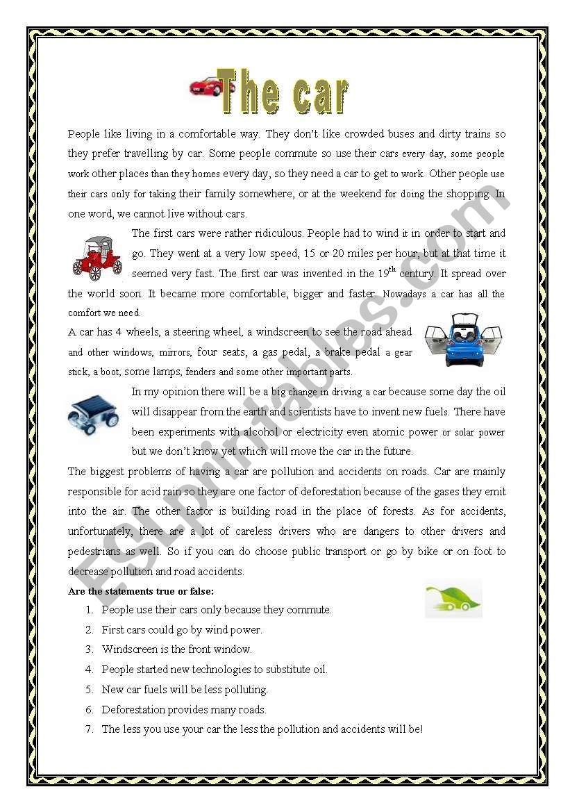 Cars Reading Comprehension Worksheet Games4esl