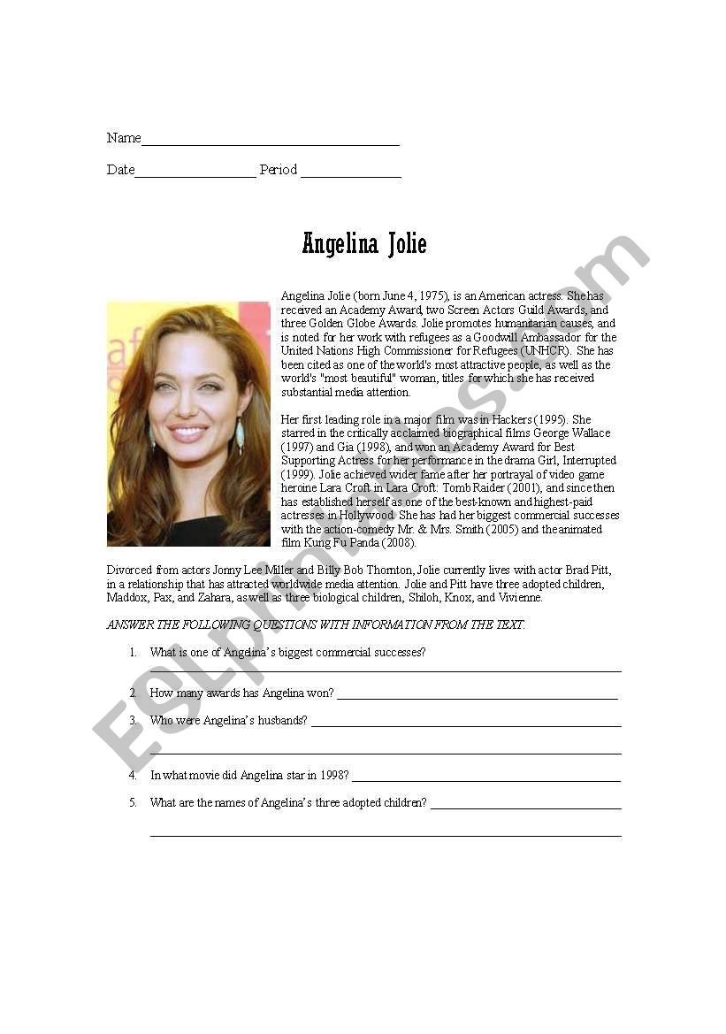 Reading Comprehension Prompt Celebrity Angelina Jolie ESL Worksheet By Milama