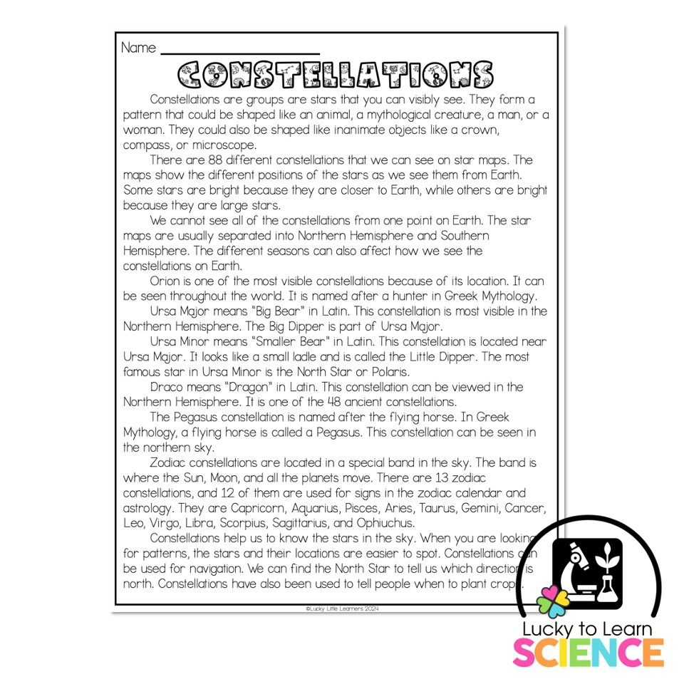 Lucky To Learn Science Constellations Reading Passage Article Lucky Little Learners