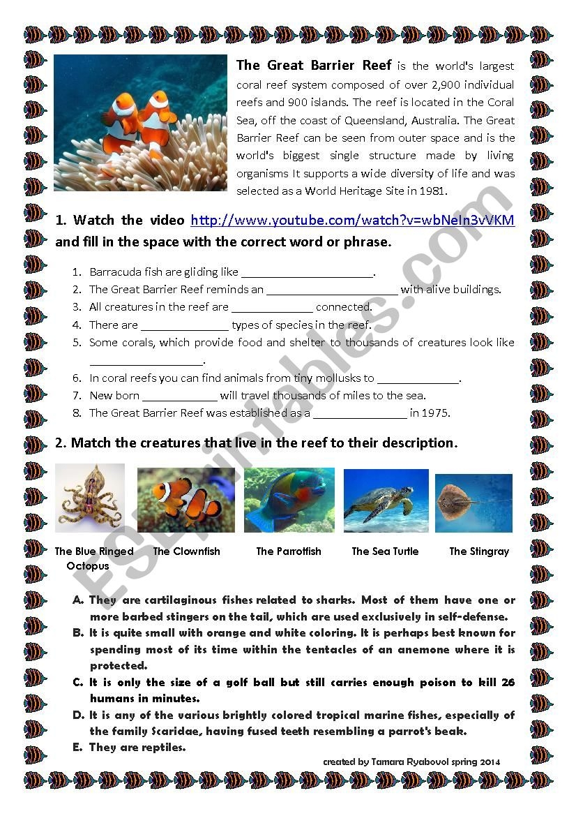 Exploring Oceans Great Barrier Reef ESL Worksheet By Kimto