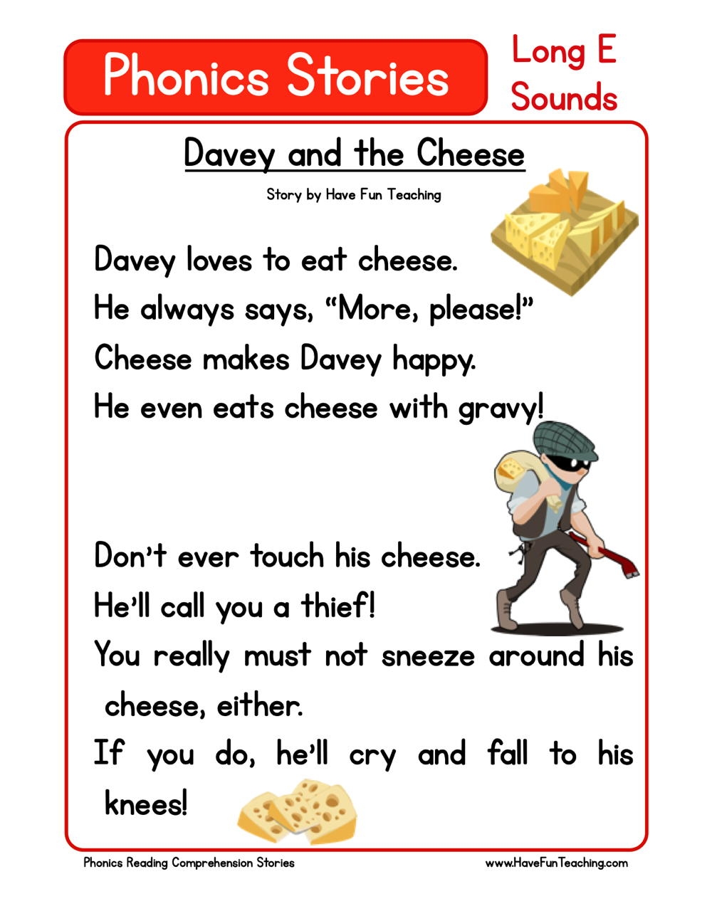 Davey And The Cheese Phonics Reading Comprehension Story Worksheet