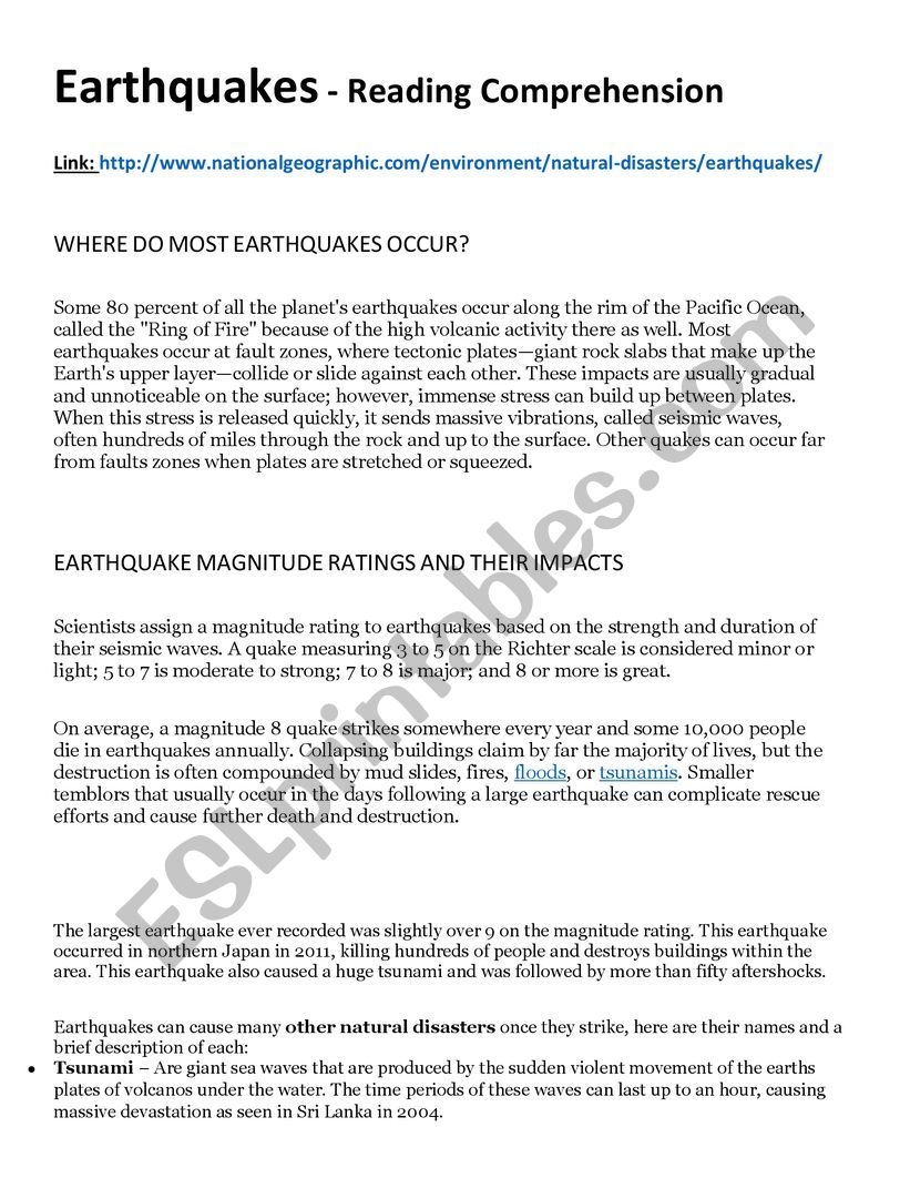 EARTHQUAKES READING COMPREHENSION ESL Worksheet By Teach barbs mtz