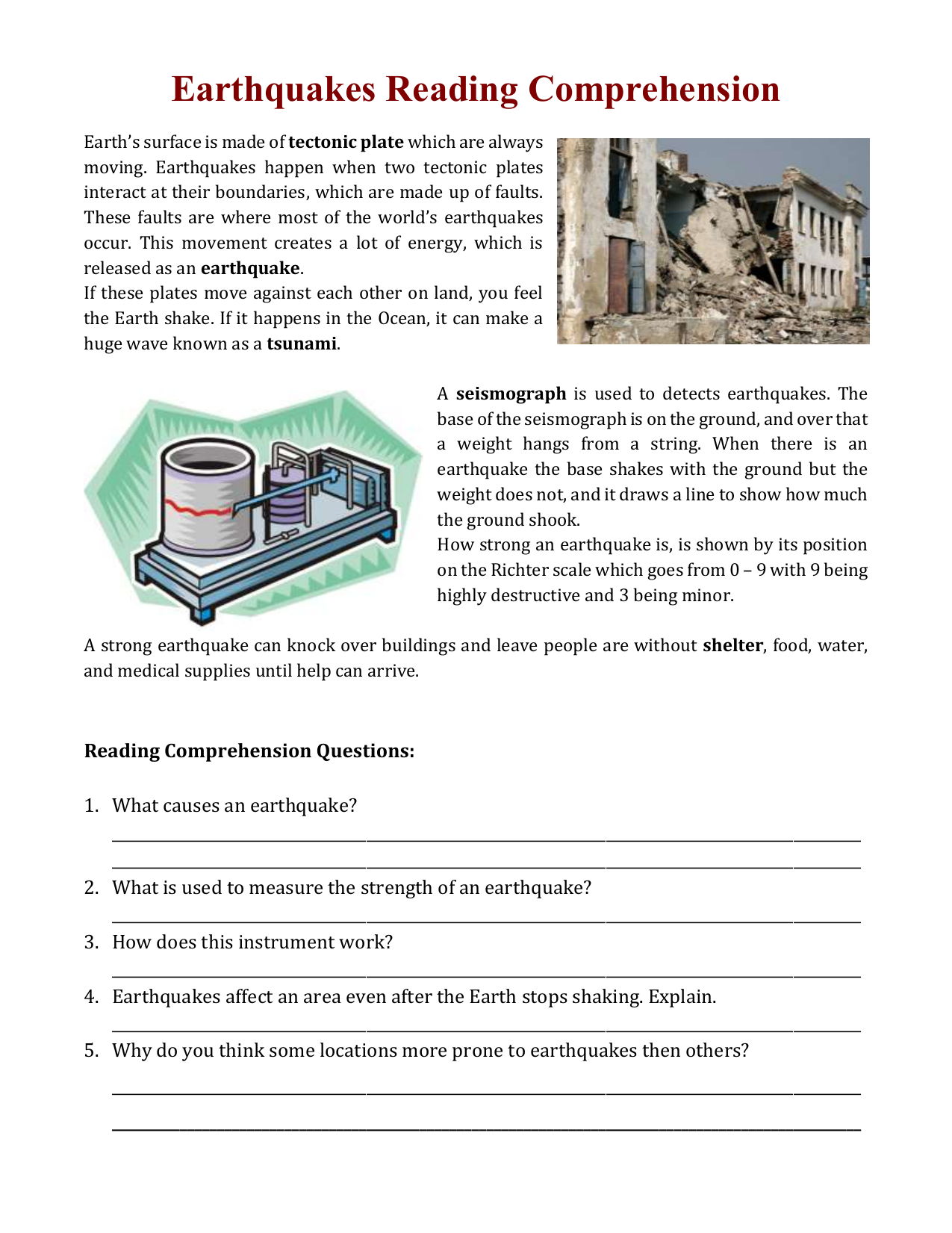 Earthquake Reading Comprehension Worksheets