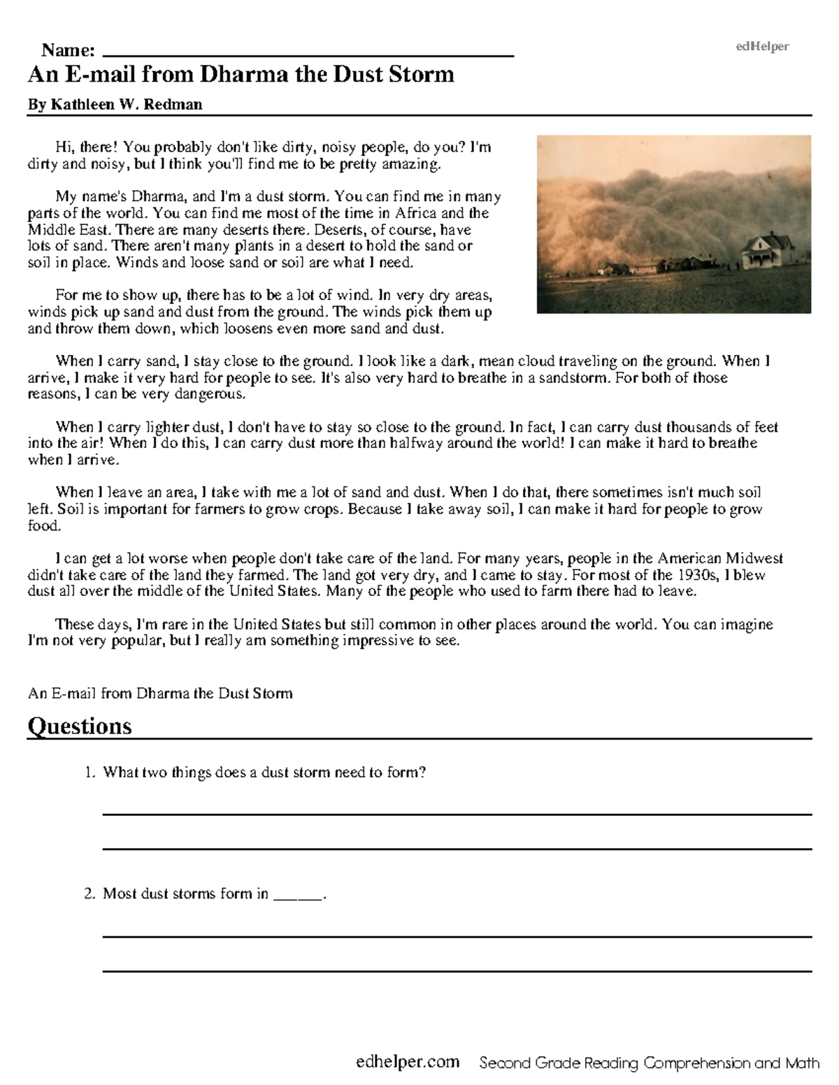 2nd Grade Reading Comprehension Worksheets Name EdHelper An E mail From Dharma The Dust Storm By Studocu