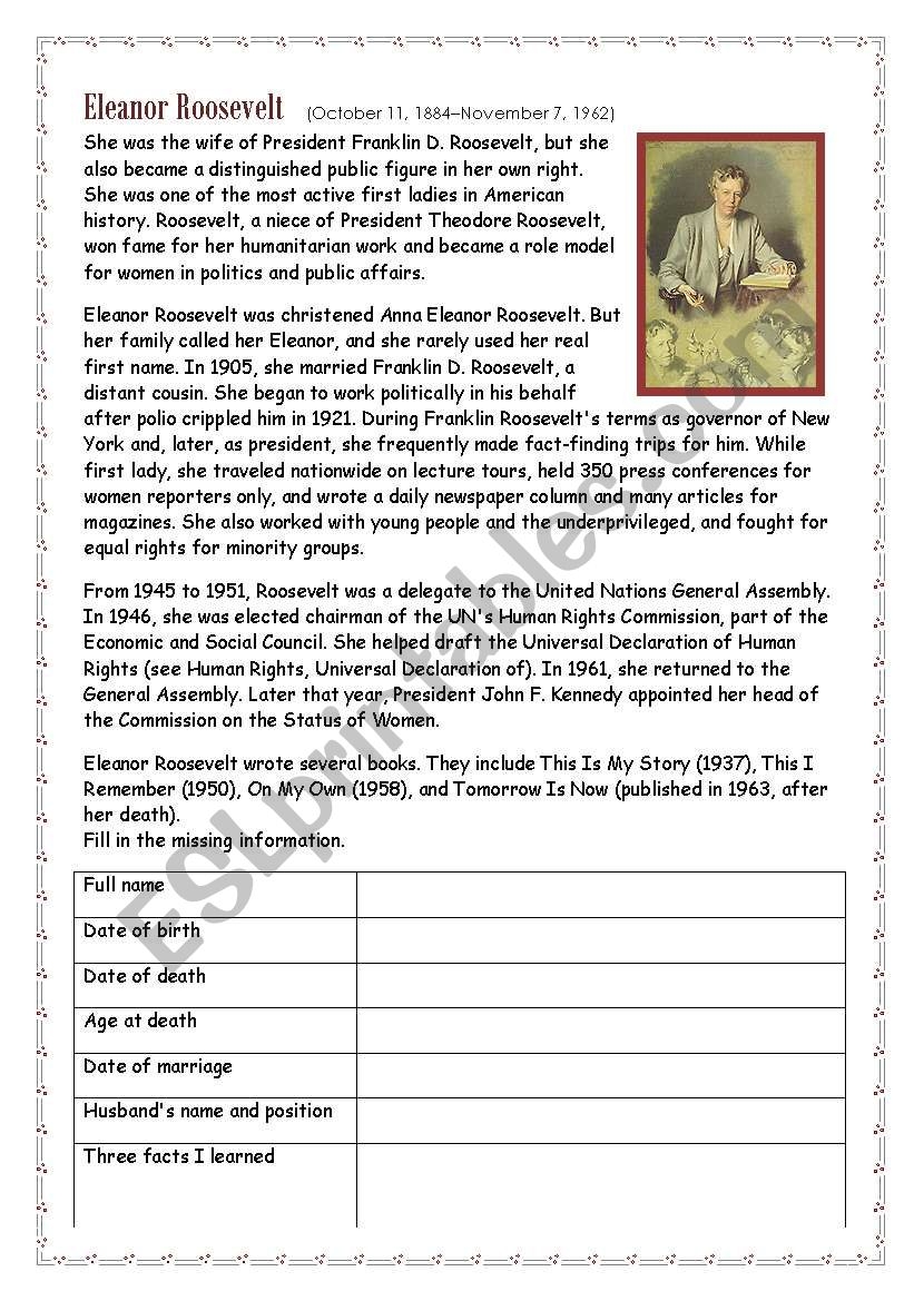 Eleanor Roosevelt ESL Worksheet By Eng789
