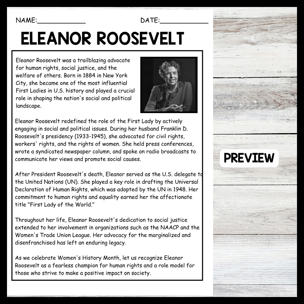 Eleanor Roosevelt Biography Reading Comprehension Passage Printable Worksheet PDF Teaching Resources