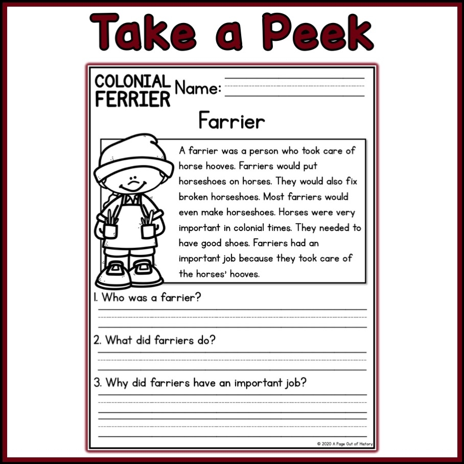 Colonial Farrier Social Studies Reading Comprehension Passages K 2