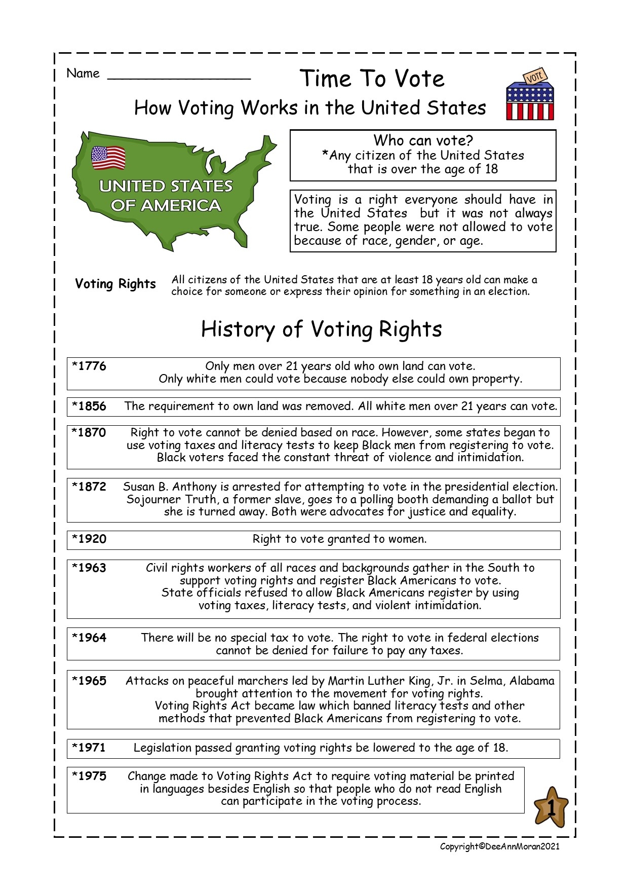 This worksheet includes a variety of comprehension questions related to elections, voting, and government. Students will have the opportunity to read informative passages and answer questions to demonstrate their understanding of the material. It’s a great way to integrate social studies into your language arts curriculum!