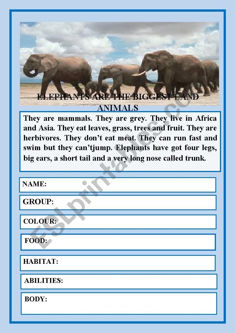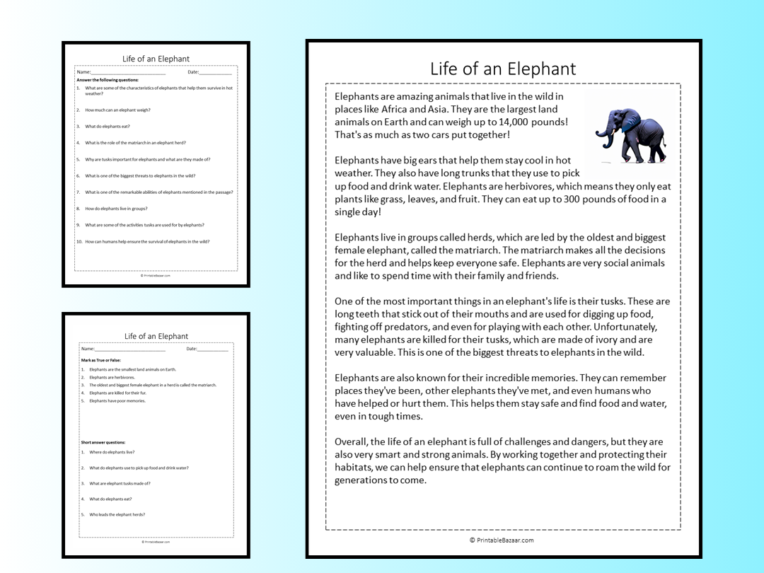 This worksheet is designed to help improve reading skills while learning interesting facts about elephants. It includes a variety of comprehension questions that challenge readers to think critically and engage with the text. Plus, the adorable elephant illustrations make the learning experience even more enjoyable.