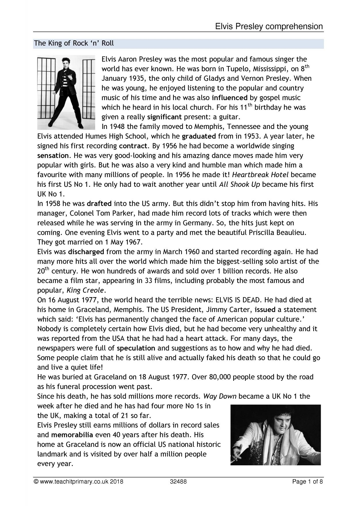 Elvis Presley Reading Comprehension Passage And Assessment Classful