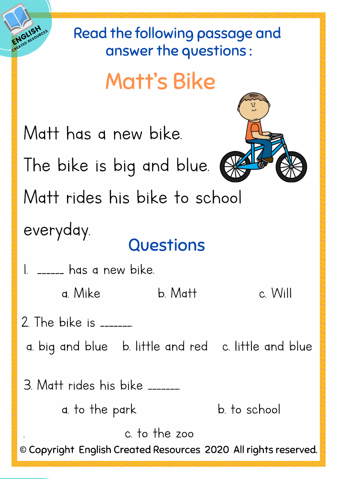 Kindergarten Reading Comprehension Part 1 English Created Resources