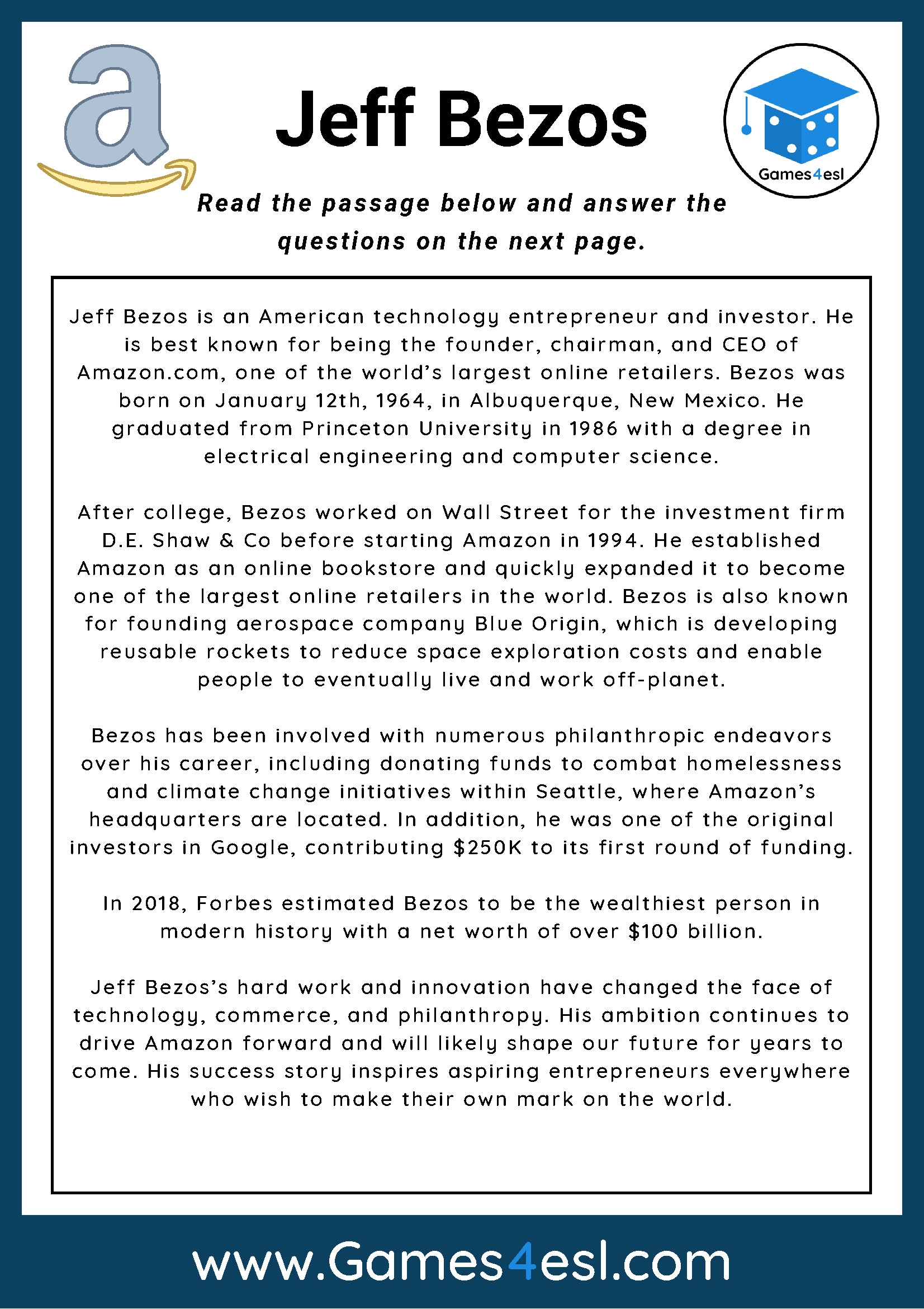 Jeff Bezos Reading Comprehension Worksheet Games4esl