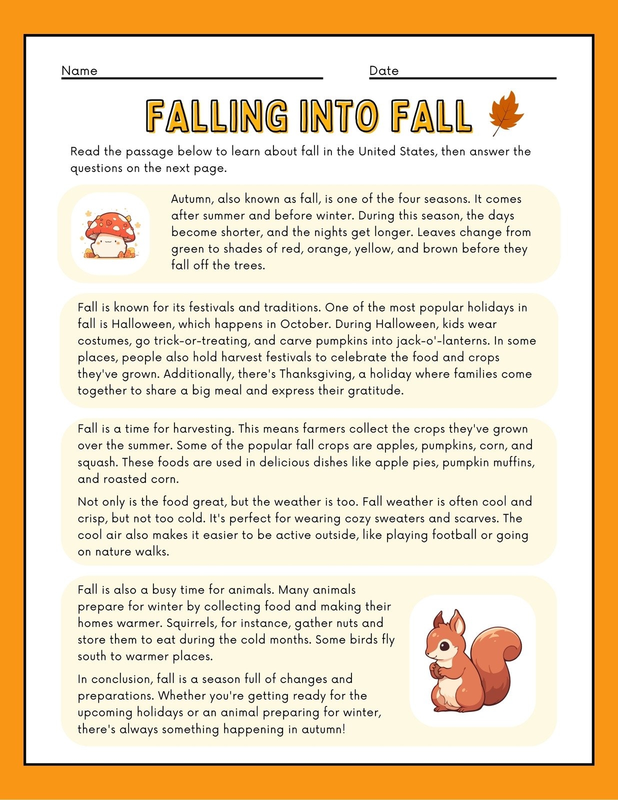 Fall Reading Comprehension Worksheets