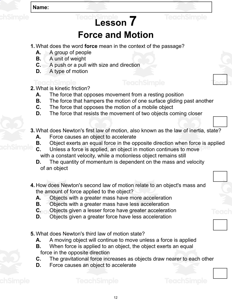 Force Reading Comprehension Worksheets With Answer Key Laney Lee