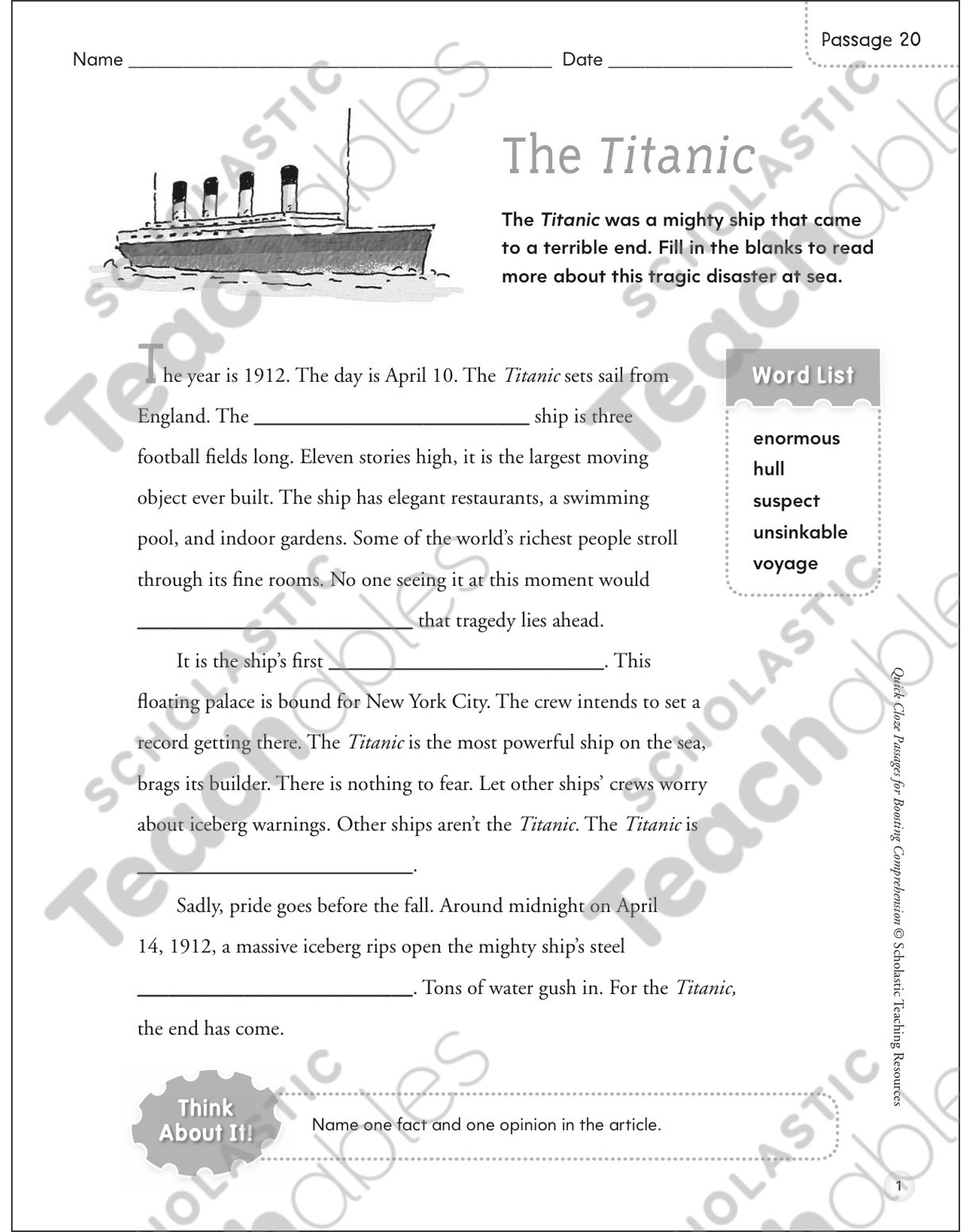The Titanic Quick Cloze Passage Printable Lesson Plans And Ideas Skills Sheets