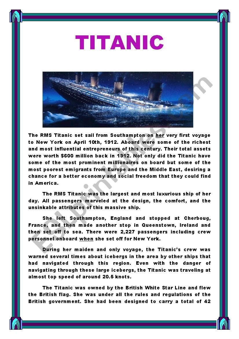 Reading Comprehension Test The Titanic Theme DISASTERS ESL Worksheet By Shmiskeen