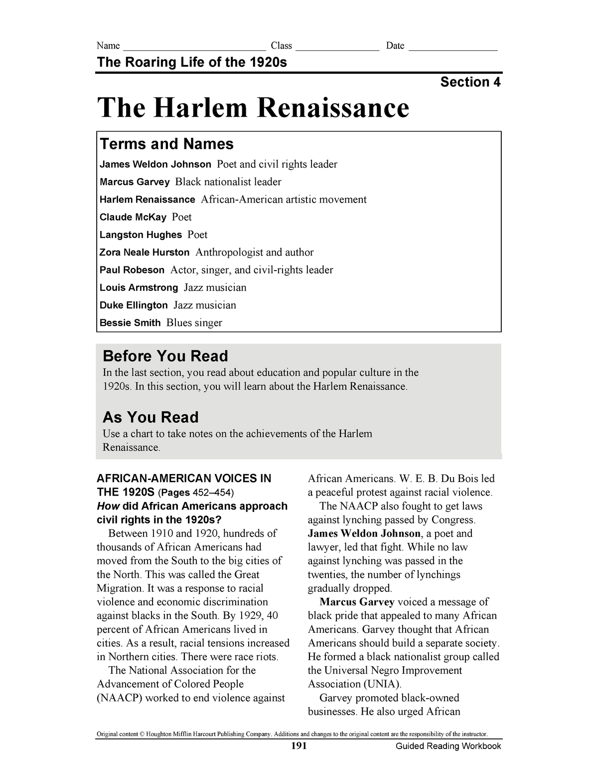 Harlem Renaissance Reading Comprehension Worksheets Pdf