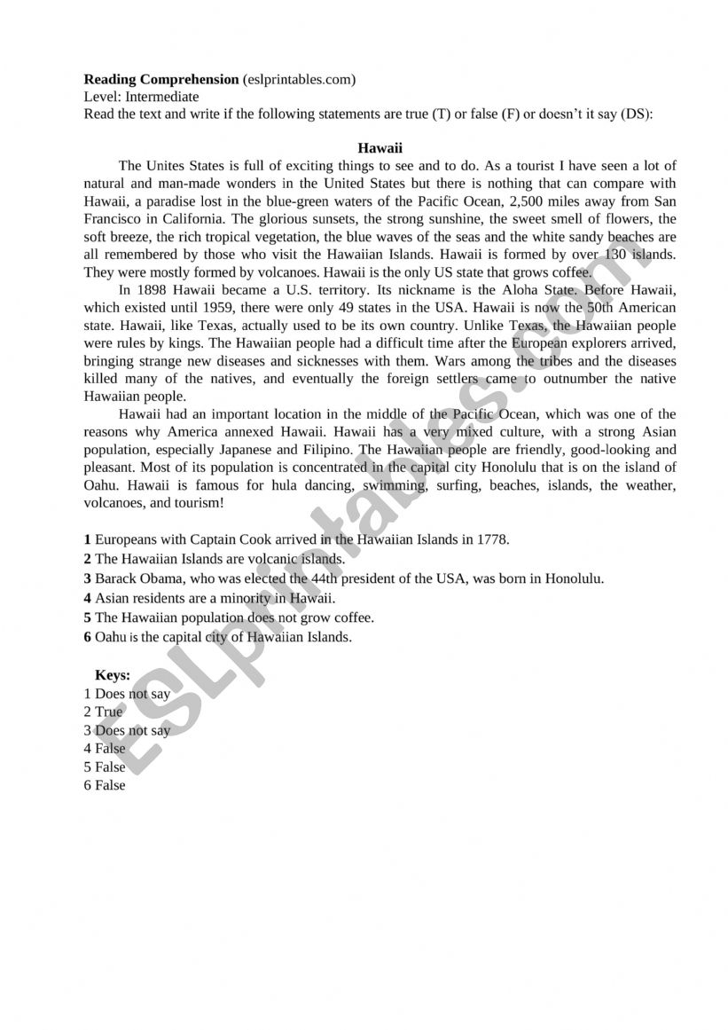 Hawaii Reading Comprehension ESL Worksheet By Zhigbaeva