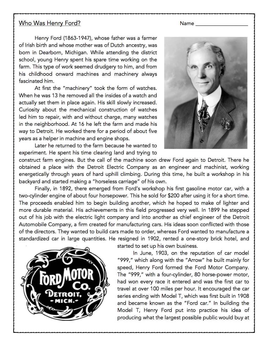 Henry Ford Reading Comprehension Worksheet