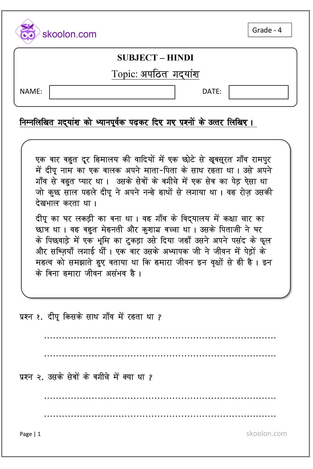 Unseen Passage Skoolon