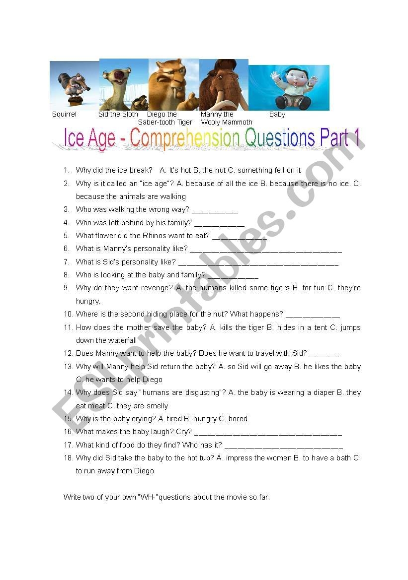 Ice Age Movie View Comprehension Questions Part 1 ESL Worksheet By Shanna83
