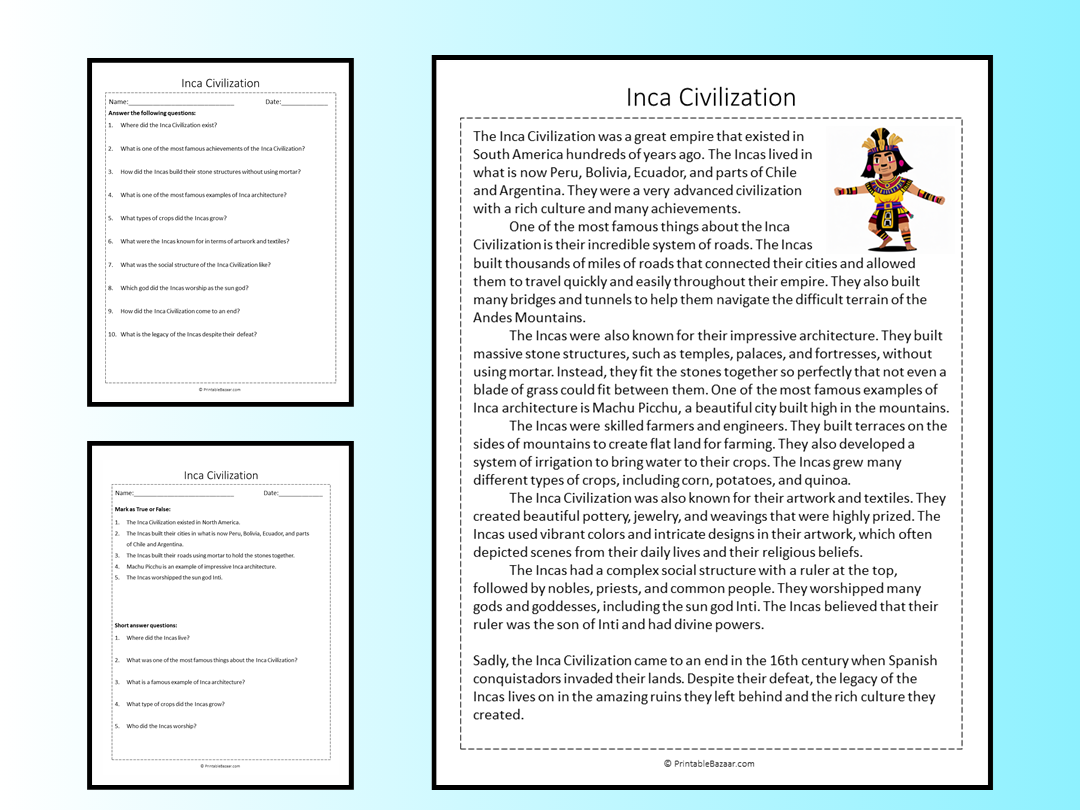 With our Inca Reading Comprehension Worksheets, students will have the opportunity to learn about the fascinating Inca civilization while also honing their ability to understand and analyze written text. These worksheets are perfect for both classroom use and at-home learning.
