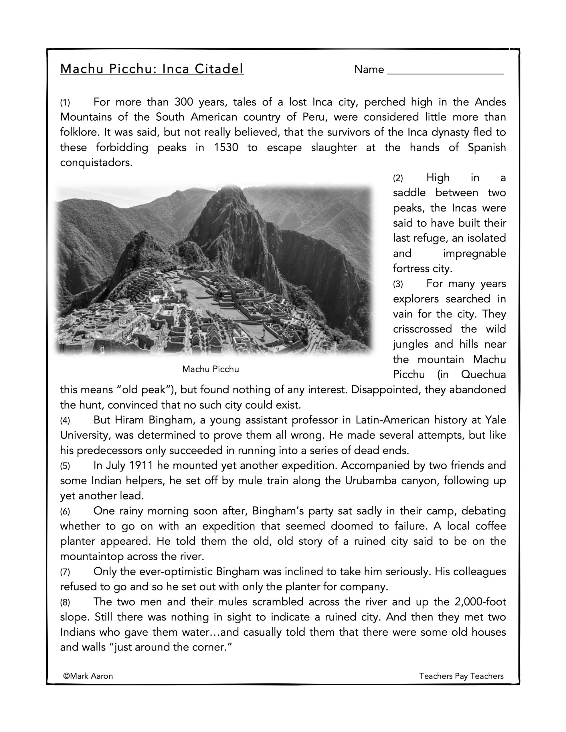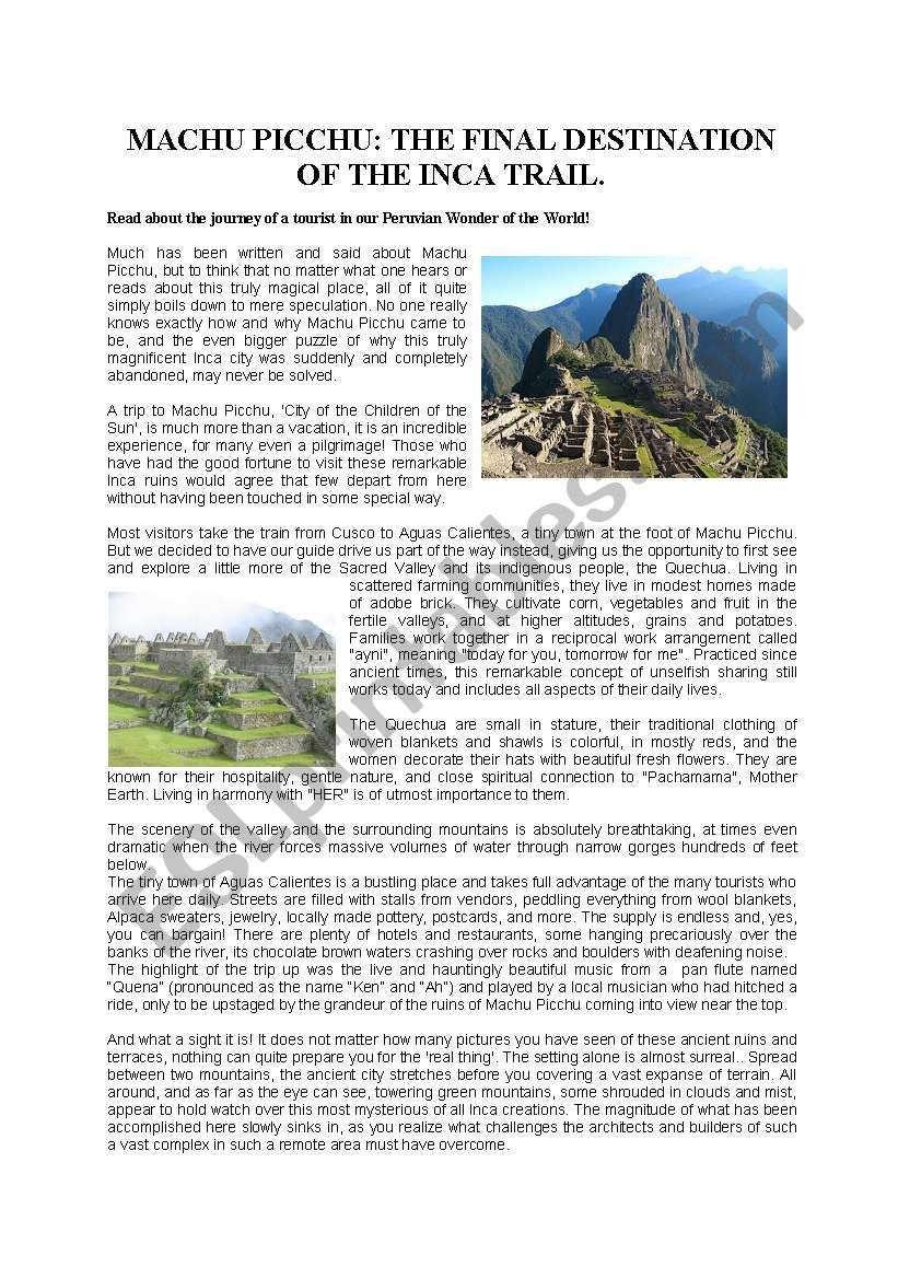 Machu Picchu Inca Citadel Reading Comprehension Passage And Assessment Classful