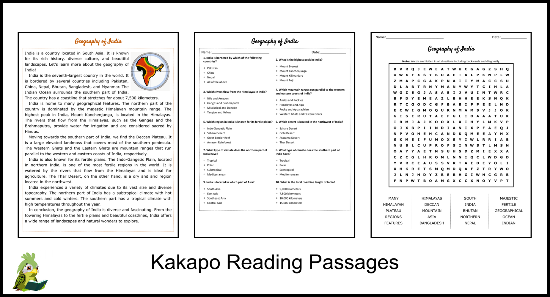 Geography Of India Reading Comprehension And Word Search Teaching Resources