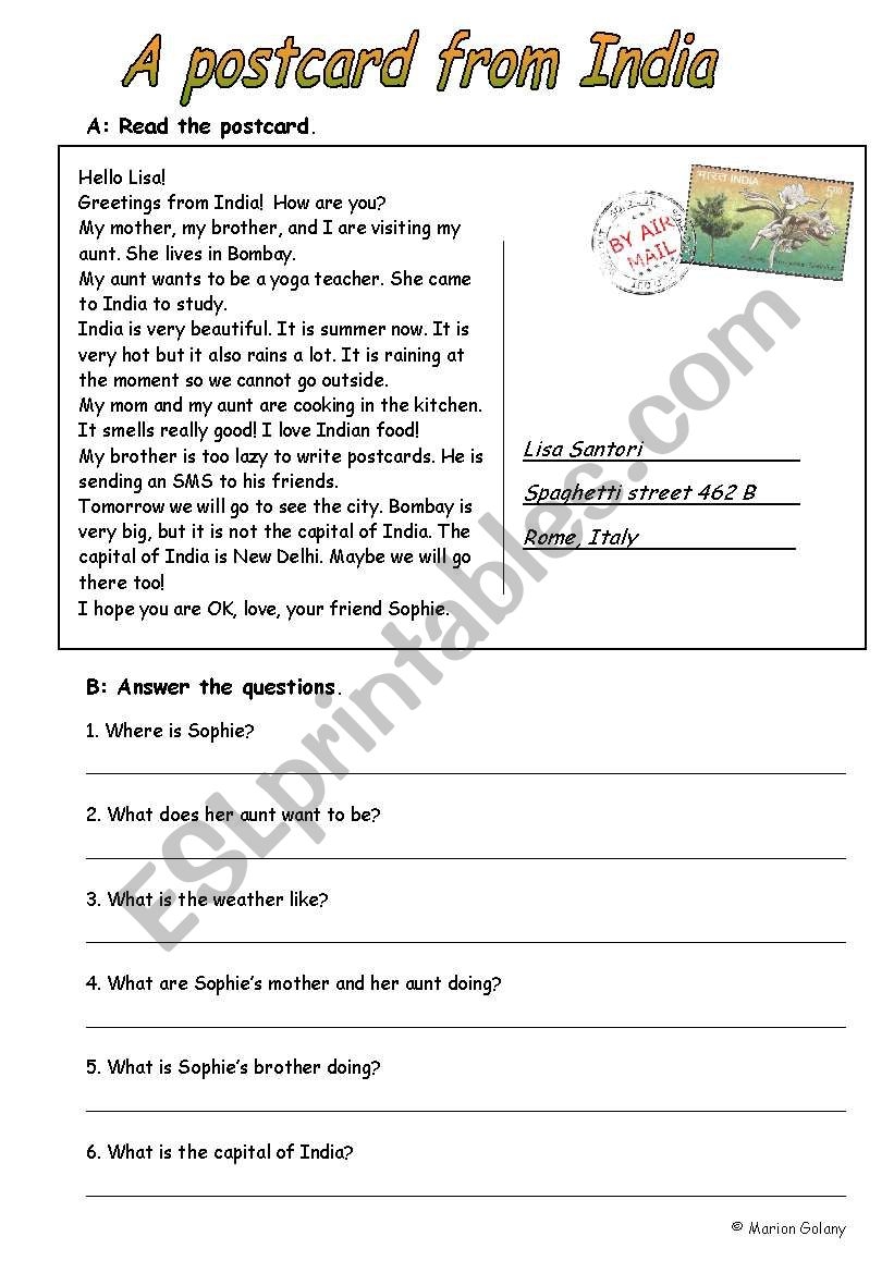 Postcard From India reading Comprehension ESL Worksheet By MarionG