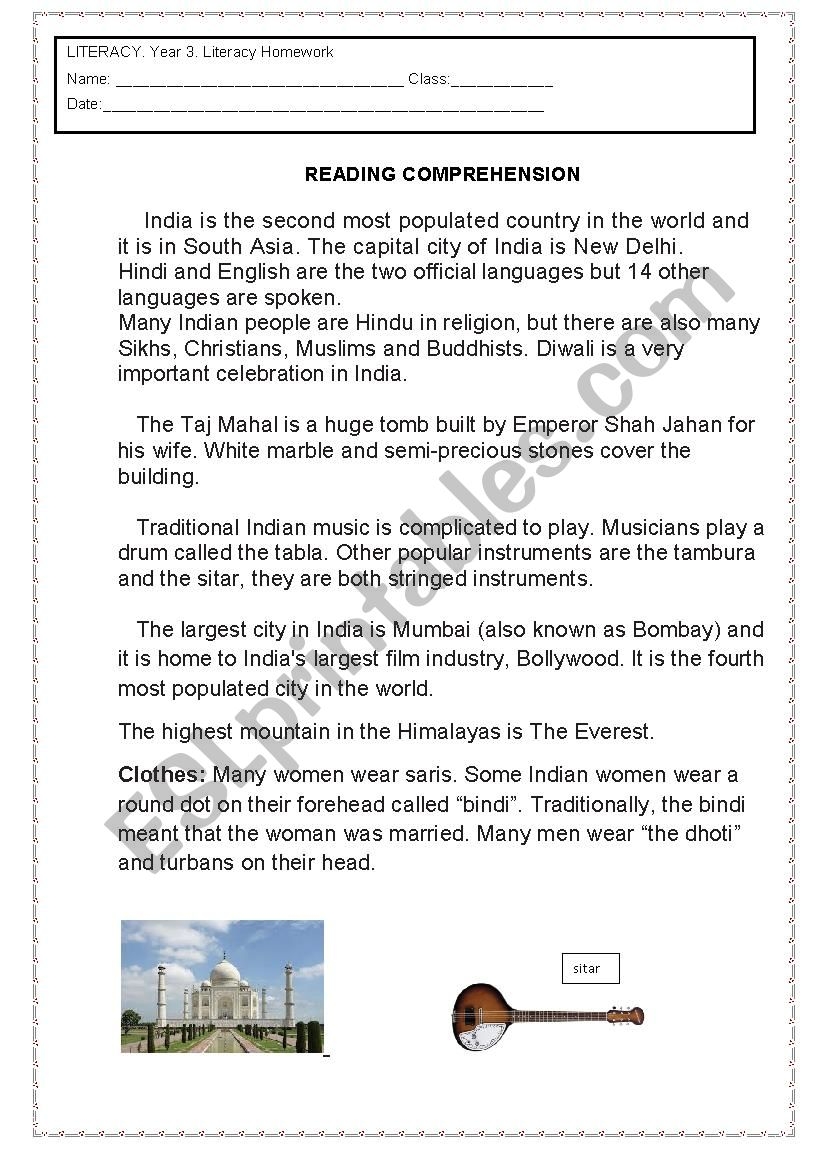 India Reading Comprehension Worksheet Pdf