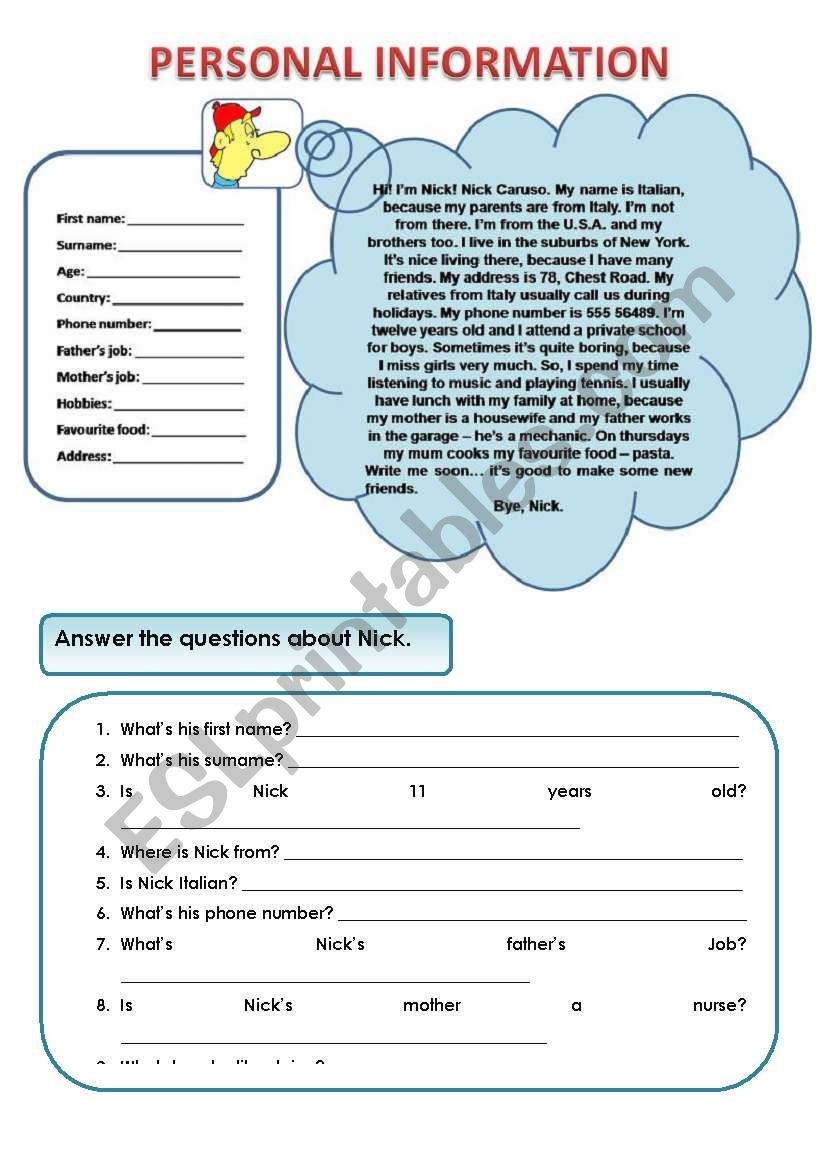 PERSONAL INFORMATION READING AND COMPREHENSION ESL Worksheet By Evelinamaria
