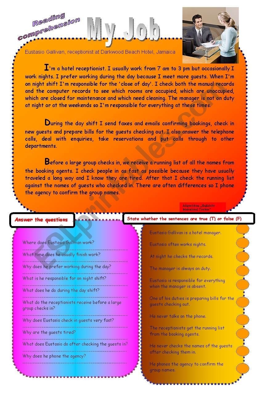 Reading Comprehension My Job ESL Worksheet By Myszunia