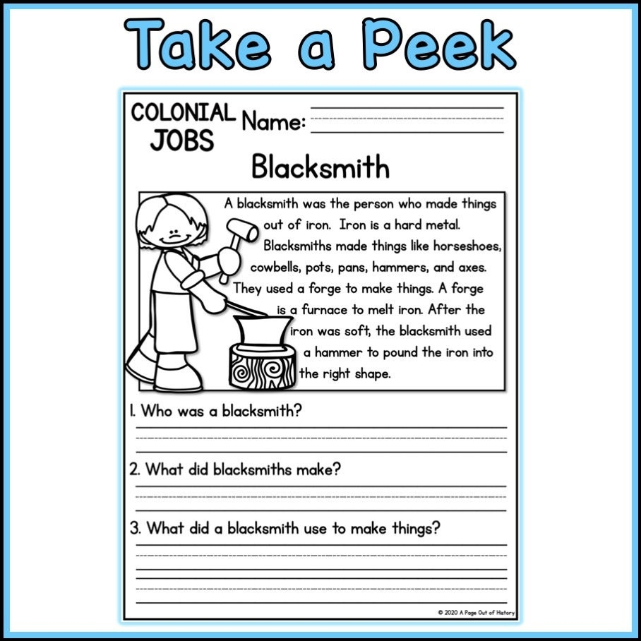 1st 2nd Grade Reading Comprehension Colonial Jobs Passages U0026 Questions Classroom Homeschool No Prep Printable Standards aligned Etsy