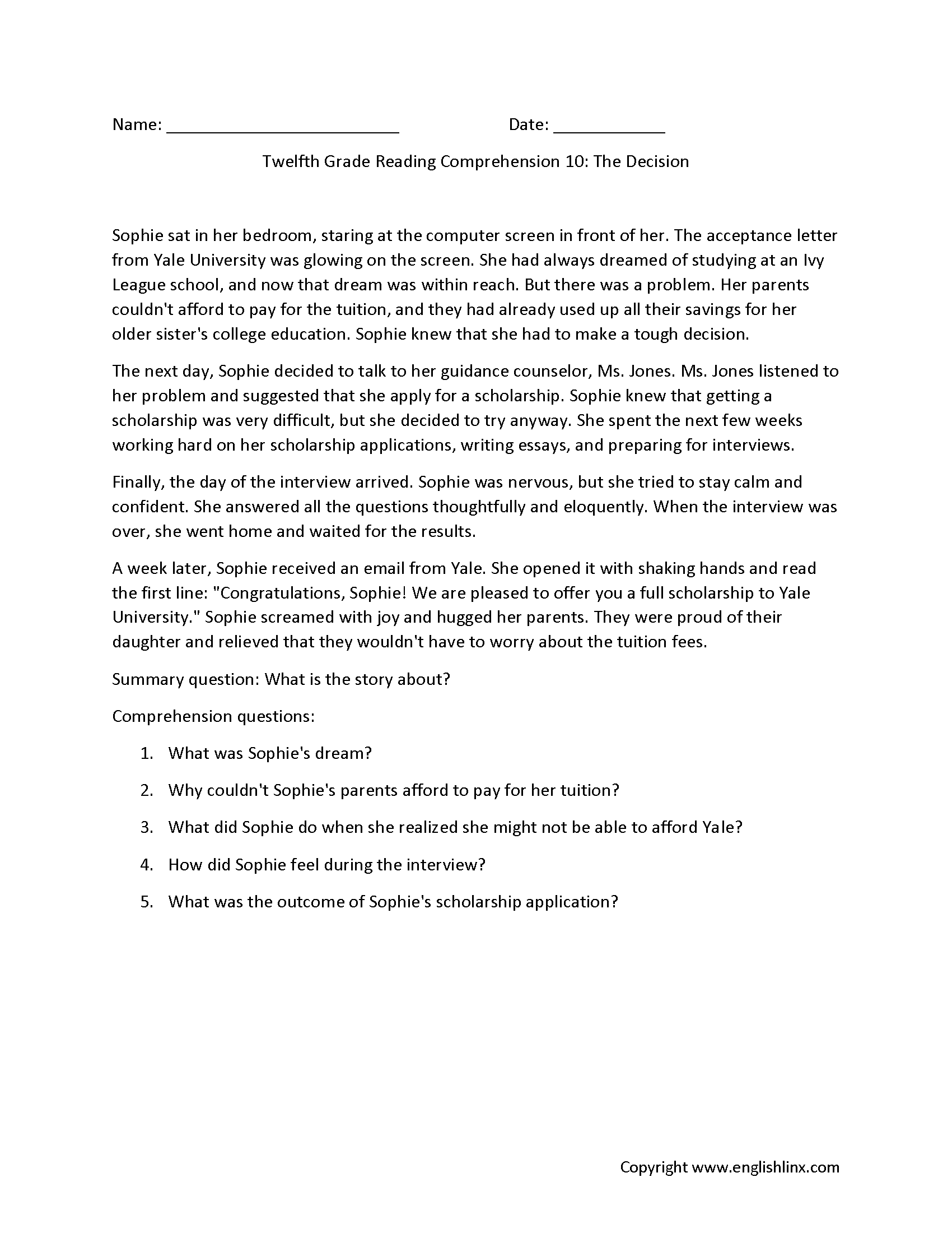 Reading Comprehension Worksheets Twelfth Grade Reading Comprehension Worksheets