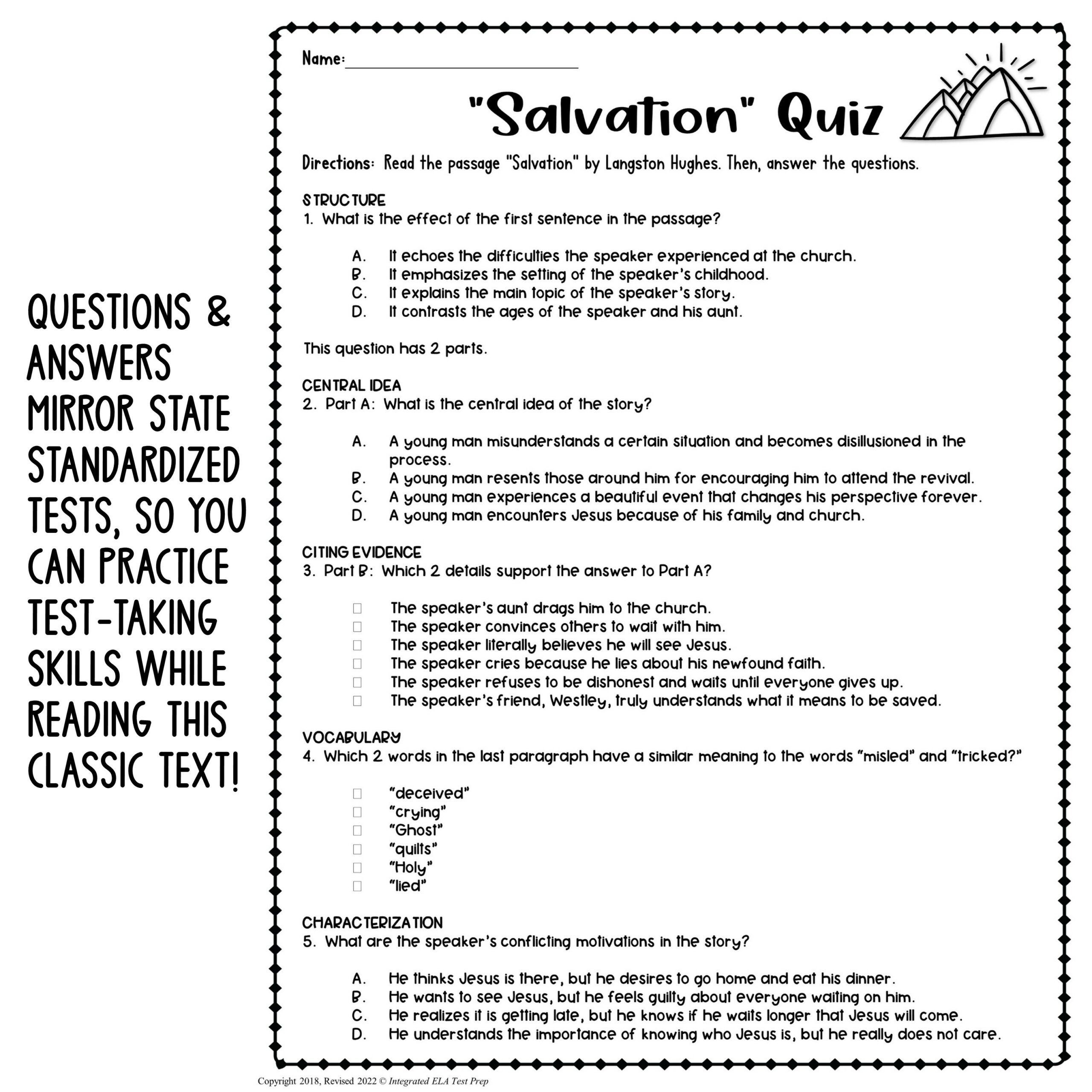 Salvation By Langston Hughes Reading Comprehension Test Prep Quiz