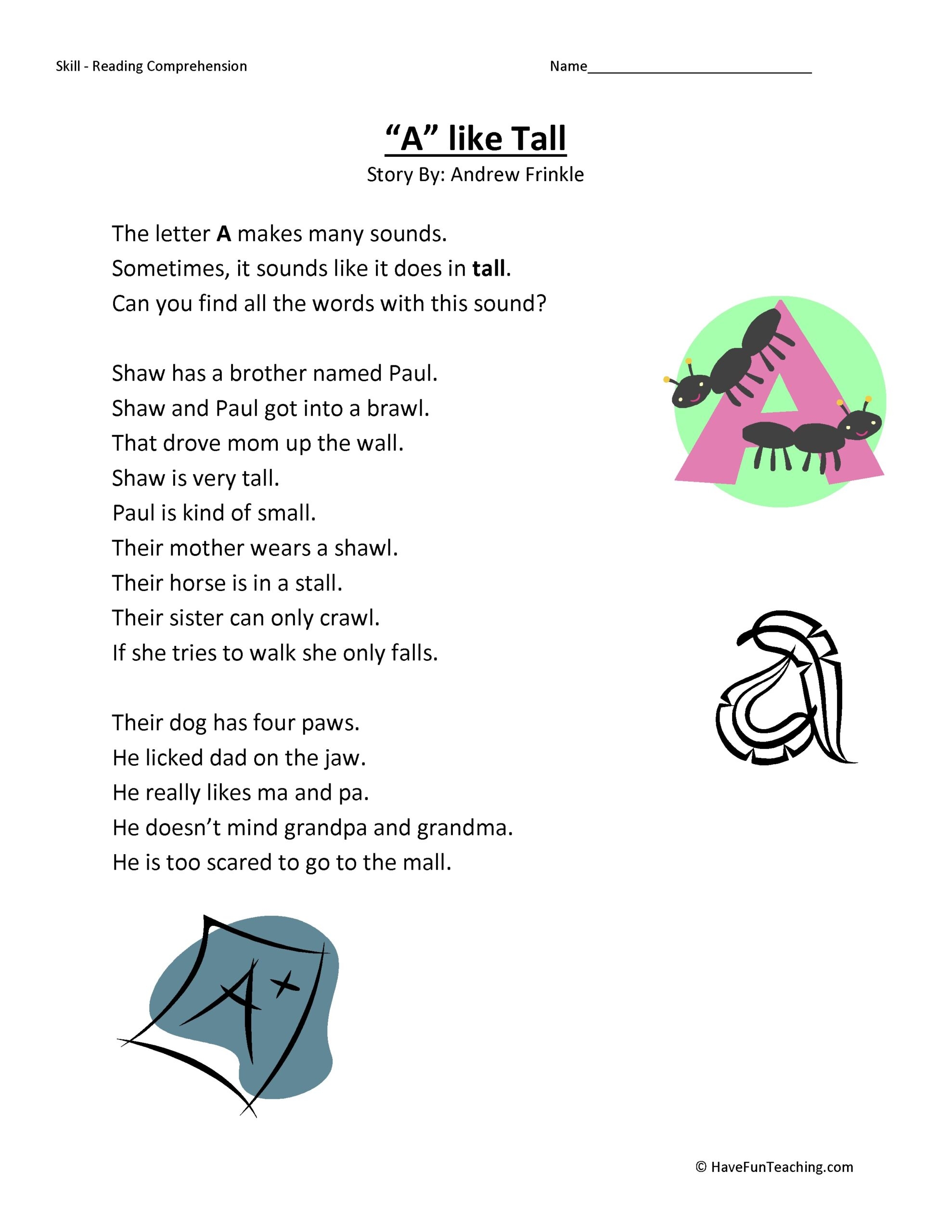 A Like Tall Reading Comprehension Worksheet Have Fun Teaching