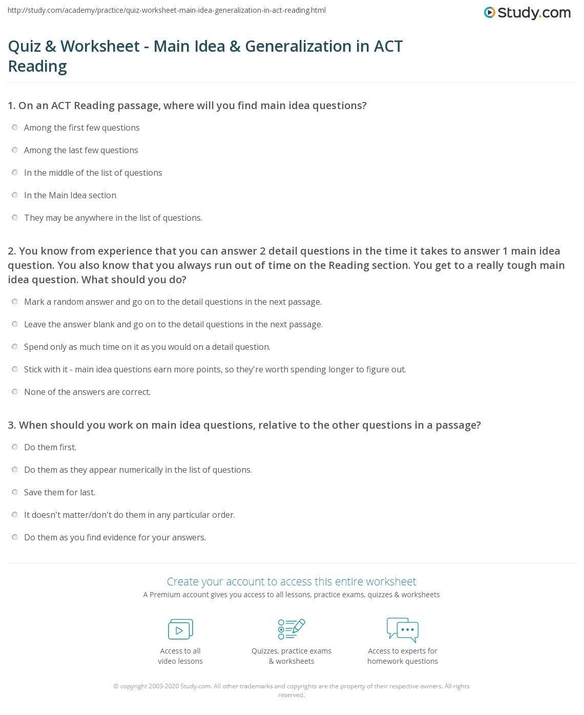 Quiz U0026 Worksheet Main Idea U0026 Generalization In ACT Reading Study