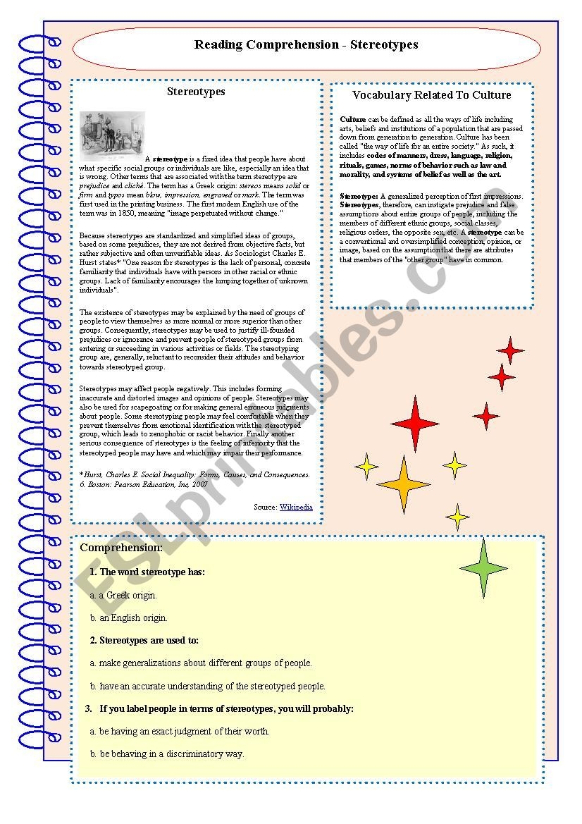 Stereotypes Reading Comprehension With Key ESL Worksheet By Ibizanightcluber